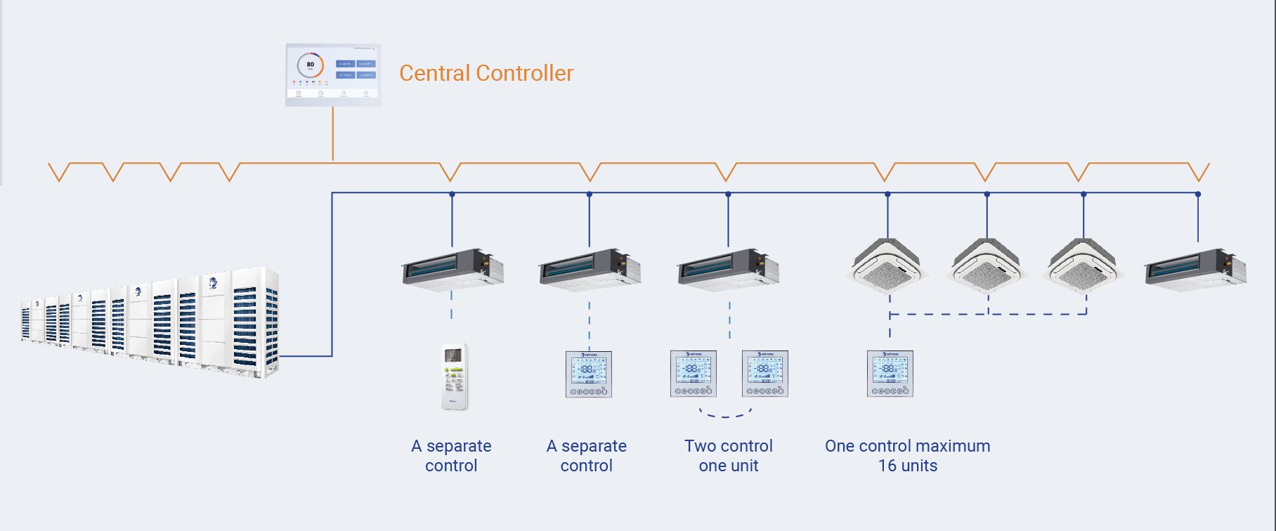 • Collegamento fino a 16 sistemi e 180 unità interne; impostazione semplice dei parametri delle unità interne