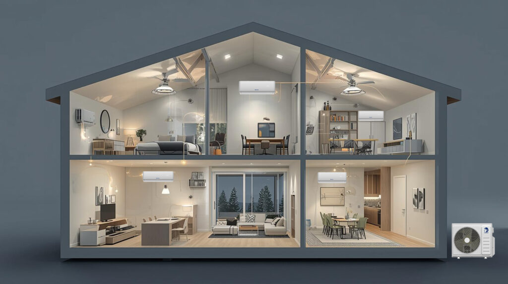 Il sistema consente di collegare fino a cinque unità interne a un’unica unità esterna, garantendo un microclima confortevole in più ambienti allo stesso tempo. Questa soluzione è particolarmente vantaggiosa per appartamenti, uffici e hotel, dove l’ottimizzazione degli spazi e un’estetica pulita dell’edificio sono importanti. Inoltre, il funzionamento centralizzato permette una distribuzione più efficiente dell’energia per riscaldamento e raffrescamento tra i vari ambienti, riducendo i consumi elettrici e mantenendo un equilibrio termico costante in tutto l’edificio.